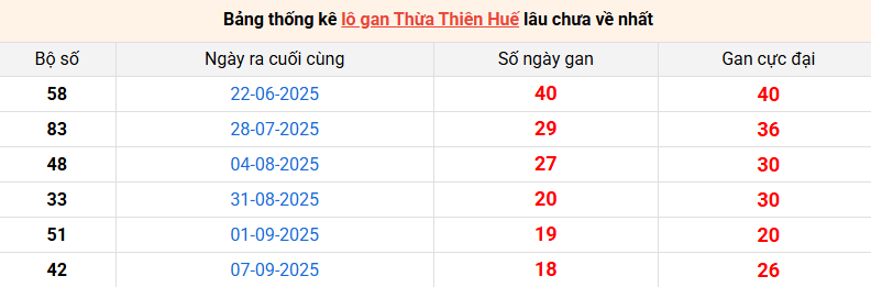 Bảng thống kê lô gan Huế lâu về nhất 10/11/2025