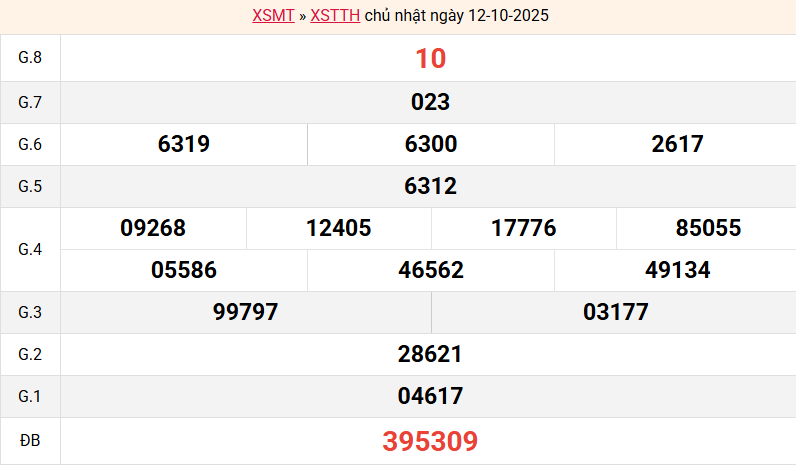 Mời các bạn xem lại bảng kết quả kỳ trước với giải đặc biệt, giải tám, lô tô 2 số để có thể đưa ra nhận định dự đoán TTH ngày 13/10 năm 2025 chuẩn xác nhất.
