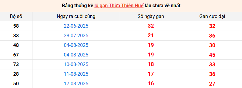 Bảng thống kê lô gan Huế lâu về nhất 13/10/2025