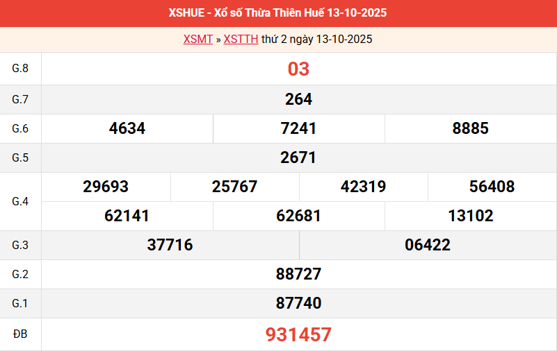 Bảng kết quả Huế ngày 13/10/2025 tuần trước