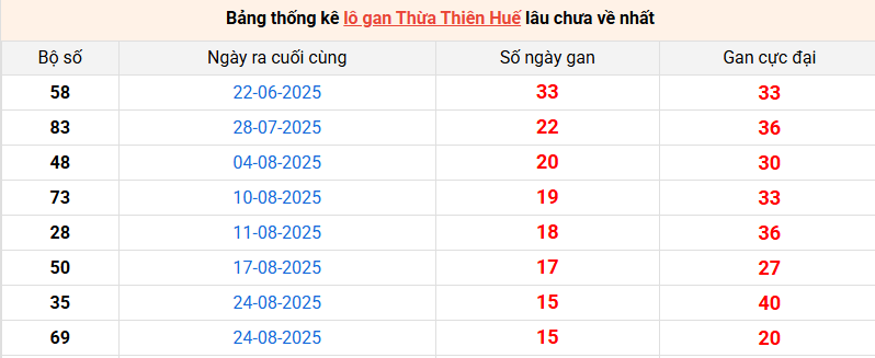 Bảng thống kê lô gan Huế lâu về nhất 19/10/2025