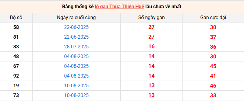 Bảng thống kê lô gan Huế lâu về nhất 28/9/2025