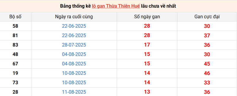 Bảng thống kê lô gan Huế lâu về nhất 29/9/2025
